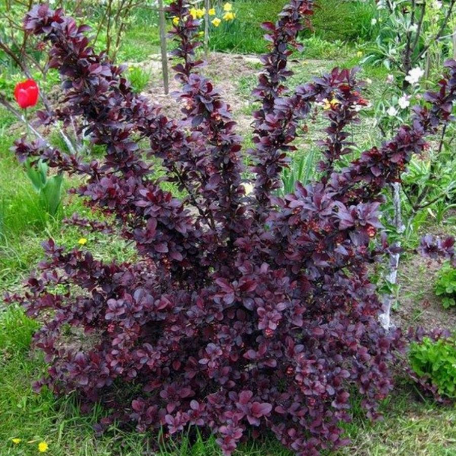Листья пурпурно-фиолетовые, осенью ярко-красные.