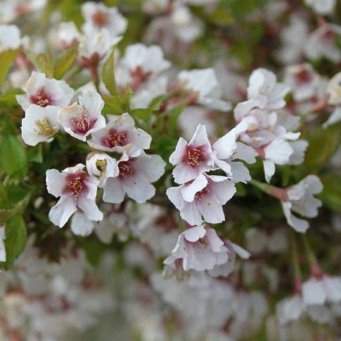 Цветы бело-розовые с ярко-пурпурным центром, до 2 см в диаметре.