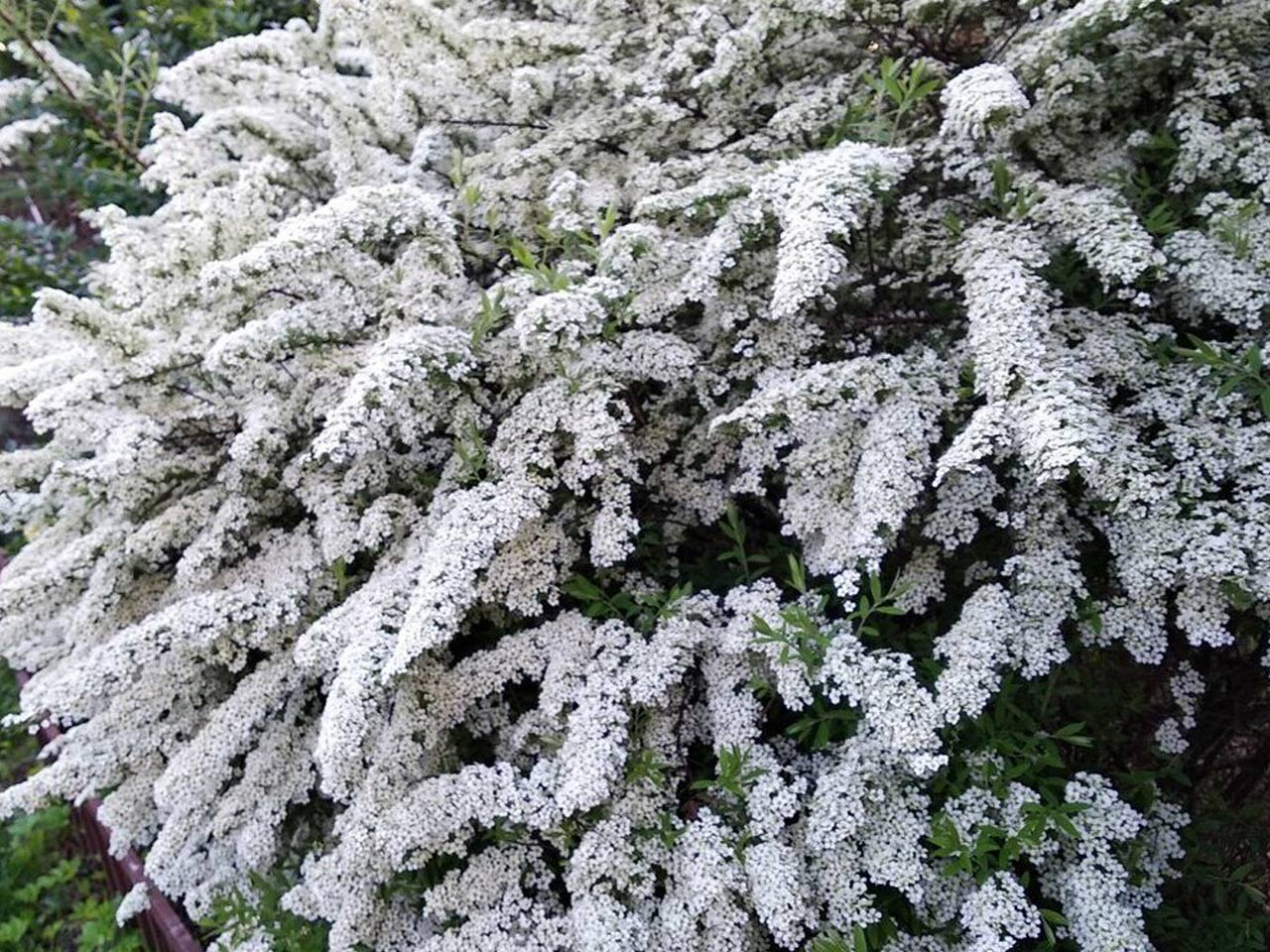 Изящно ниспадающие побеги густо, практически полностью, усыпаны белоснежными соцветиями, превращая кустарник во время цветения в небольшой «пенный» водопад.