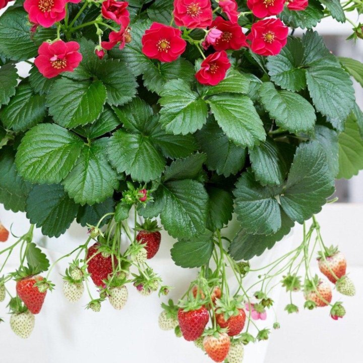 Восхитительная, необыкновенная клубника с крупными, алыми цветками похожими на маленькие розочки, плодоносит весь сезон и служит ярким декоративным украшением любого садового участка, беседки, террасы, балкона или как комнатное растение.